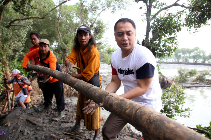 Saat di lokasi, Wali Kota Eri tampak sibuk gotong royong bersama warga membuat tanggul. Meskipun kondisi tanah berlumpur, ia tak segan ikut membantu menyiapkan kayu bambu hingga karung untuk menambal tanggul yang jebol akibat rob.