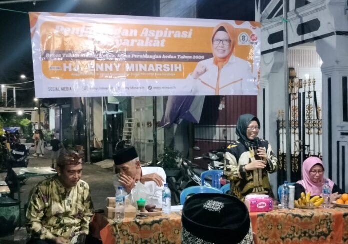 Anggota DPRD Kota Surabaya, Enny Minarsih, menyerap aspirasi warga terkait evaluasi bantuan sosial dan kebijakan kepemudaan saat melaksanakan reses masa persidangan kedua tahun sidang 2026 di RT 20 RW 06 Tambak Asri, Kelurahan Morokrembangan, Kecamatan Krembangan, Surabaya, Jumat malam (6/2/2026).