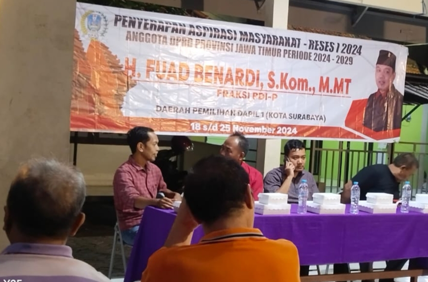 Anggota DPRD Provinsi Jawa Timur dari Fraksi PDI Perjuangan, H. Fuad Benardi, S.Kom., M.MT., menggelar kegiatan reses dalam rangka menyerap aspirasi masyarakat. Acara ini berlangsung di salah satu gedung pertemuan di Kota Surabaya pada periode 18 hingga 25 November 2024.