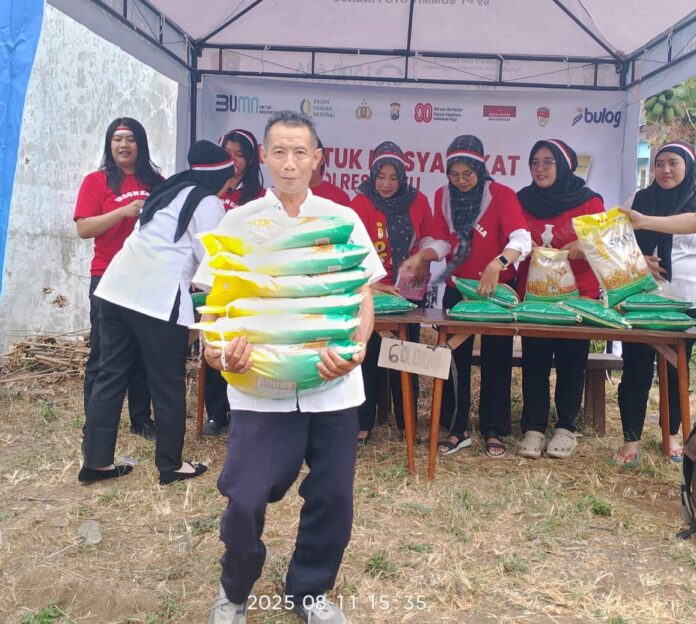 Menyambut HUT ke-80 Kemerdekaan Republik Indonesia, Polres Batu Polda Jawa Timur (Jatim) melalui Satreskrim menggelar Gerakan Pangan Murah di Kecamatan Junrejo, Kota Batu, Senin (11/8/2025).