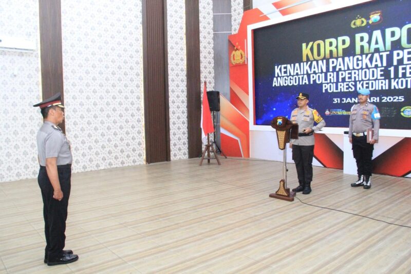 Polres Kediri Kota menggelar upacara Kenaikan Pangkat Pengabdian di Gedung Rupatama Polres Kediri Kota, Jum’at (31/1/2025). Upacara ini dipimpin Kapolres Kediri Kota AKBP Bramastyo Priaji, S.H., S.I.K., M.Si.