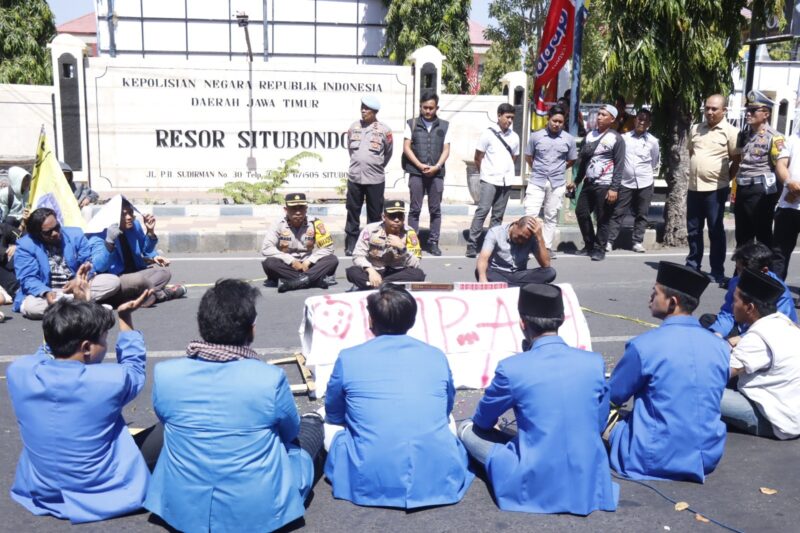 Kapolres Situbondo AKBP Dwi Sumrahadi Rakhmanto, S.H., S.I.K., M.H. menemui mahasiswa tergabung dalam Pengurus Cabang Pergerakan Mahasiswa Islam Indonesia (PMII) Situbondo yang menggelar aksi damai dan doa bersama di depan Mako Polres Situbondo.