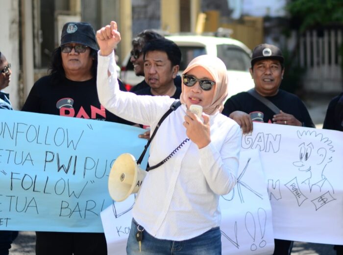 āKami di daerah, khususnya di wilayah Jawa Timur merasa malu sebagai anggota PWI, karena kemelut di kepengurusan PWI Pusat justru membuat marwah organisasi semakun terpuruk,ā ujar Ita, peserta aksi.