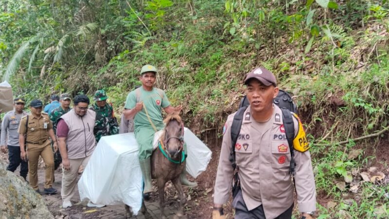 Medan yang sempit, licin, dan sulit dijangkau kendaraan bermotor memaksa para petugas menggunakan kuda sebagai alat transportasi utama mengangkut Logistik Pilkada.