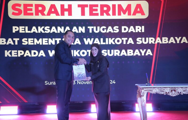Setelah menjalankan tugas selama dua bulan sebagai Penjabat sementara (PJs) Wali Kota Surabaya, Restu Novi Widiani hari ini resmi mengakhiri masa baktinya, Sabtu, (23/11/2024). Di akhir masa tugasnya, PJs Restu Novi melakukan serah terima pelaksanaan tugas kepada Wali Kota Surabaya Eri Cahyadi, di kantor Balai Kota.