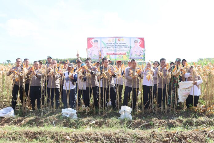 Dalam rangka mendukung ketahanan pangan nasional, Polres Kediri Kota Polda Jatim bersama kelompok tani melaksanakan panen raya jagung di Dusun Kamal Desa Banyakan Kecamatan Banyakan Kabupaten Kediri, Rabu (30/4/2025).