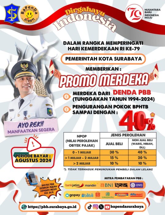 Pemerintah Kota (Pemkot) Surabaya mengajak masyarakat untuk memanfaatkan program “Promo Merdeka” pembebasan sanksi administratif Pajak Bumi Bangunan (PBB) dan pengurangan pokok Bea Perolehan Hak atas Tanah dan Bangunan (BPHTB). Promo Merdeka ini, berlaku mulai dari periode 1-31 Agustus 2024.