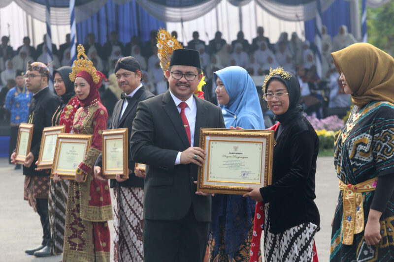 Pemerintah Kota (Pemkot) Surabaya menggelar upacara peringatan Hari Guru Nasional (HGN), sekaligus Hari Ulang Tahun (HUT) Korps Pegawai Republik Indonesia (KORPRI) ke-53, di Halaman Balai Kota Surabaya, Senin (25/11/2024). Dalam kesempatan tersebut, Pemkot Surabaya memberikan apresiasi berupa piagam penghargaan kepada 11 guru inovatif di Kota Pahlawan, serta menyerahkan tanda kehormatan Satyalancana Karya Satya dari Presiden Republik Indonesia (RI) Prabowo kepada tiga orang ASN.