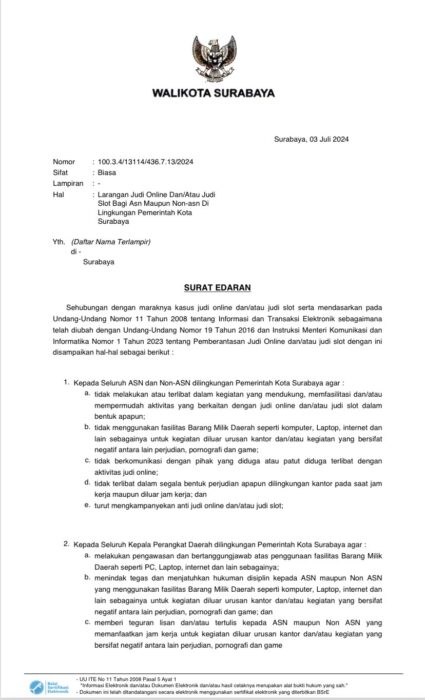 Berdasarkan Undang-Undang Nomor 11 Tahun 2008 tentang Informasi dan Transaksi Elektronik, sebagaimana telah diubah dengan Undang-Undang Nomor 19 Tahun 2016 dan Instruksi Menteri Komunikasi dan Informatika Nomor 1 Tahun 2023 tentang Pemberantasan Judi Online dan/atau judi slot, Pemerintah Kota (Pemkot) Surabaya pun mengambil sikap tegas.
