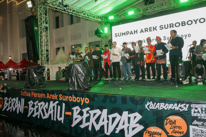Pemerintah Kota (Pemkot) Surabaya bersama Forum Pembauran Kebangsaan (FPK) Kota Surabaya menggelar deklarasi “Sumpah 100% Arek Suroboyo” di Plaza Internatio, Senin (29/12/2025) malam. Kegiatan ini diikuti pemuda Karang Taruna hingga pemuda lintas suku yang ada di Kota Surabaya.